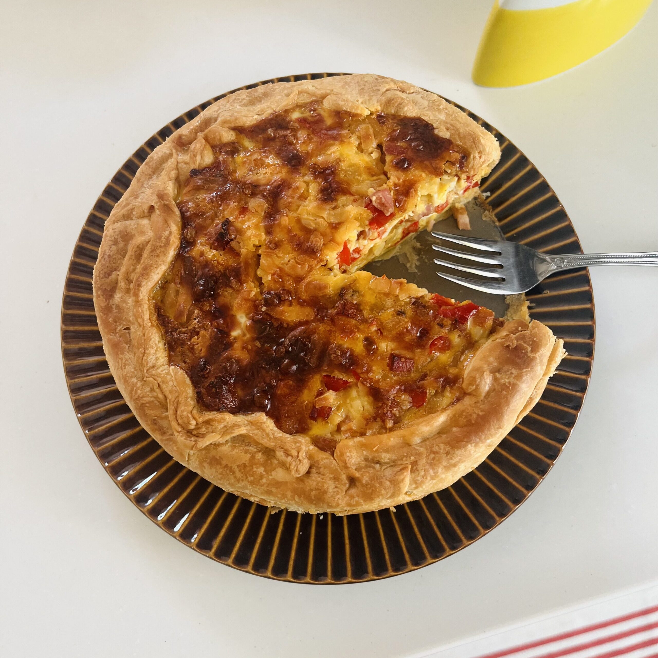 我が家の畑で収穫したパプリカとさつまいもを使って、野菜とベーコンのキッシュを作りました。